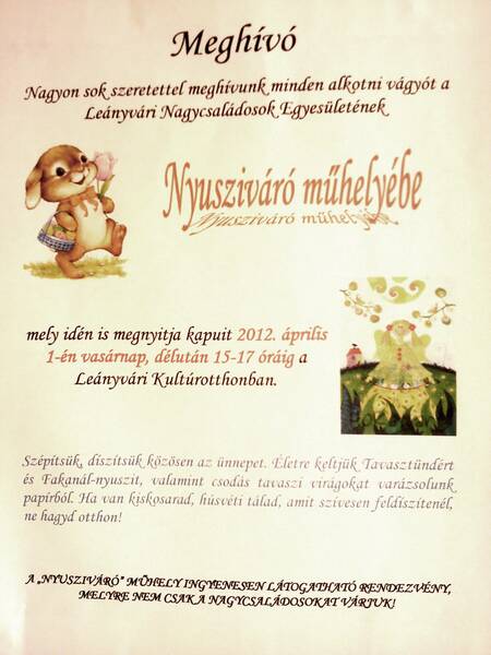 A Leányvári Nagycsaládosok Egyesülete sok szeretettel vár minden alkotni vágyót - nem csak a nagycsaládosokat - Nusziváró műhelyébe.