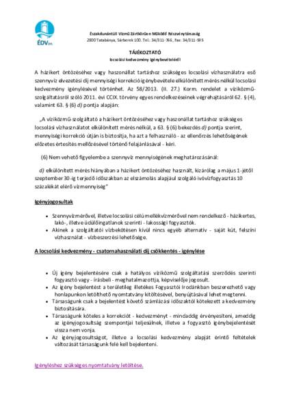 Felhívjuk figyelmüket, hogy az ÉDV Zrt. tájékoztatása alapján a házikert öntözéséhez vagy haszonállat tartáshoz szükséges locsolási vízhasználatra eső szennyvíz elvezetési díj korrekció igénybevételelocsolási kedvezmény igénylésével történik. A locsolási kedvezménnyel kapcsolatos bővebb tájékoztatást az alábbi tájékoztatóban, valamint az ÉDV Zrt. honlapján (http://www.edv.hu) olvashatnak.