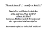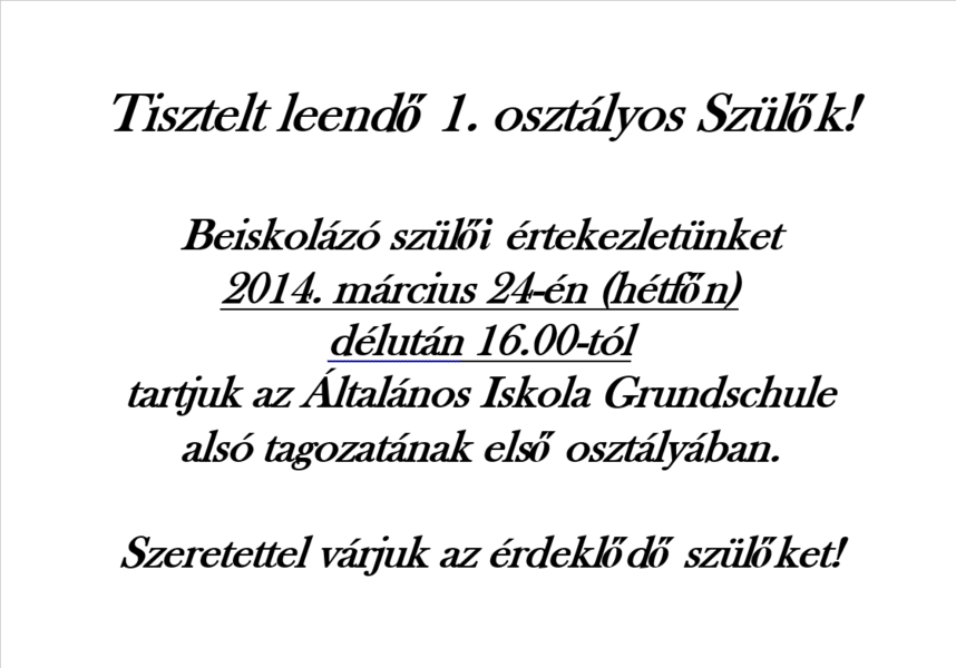 Tisztelt leendő első osztályos szülők! Beiskolázó szölői értrkezletünket 2014. március 24-én (hétfőn) tartjuk az Általános Iskola Grundschule alsó tagozatának első osztályában. Szeretettel várjuk az érdeklődő szülőket!
