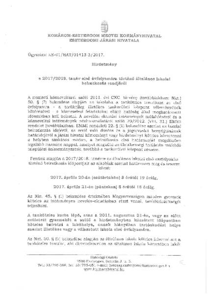 Tájékoztatom az érintett szülőket, hogy a 2017/2018. tanévre az általános iskolák első évfolyamára a beiratkozás az alábbi időpontokban lehetséges: